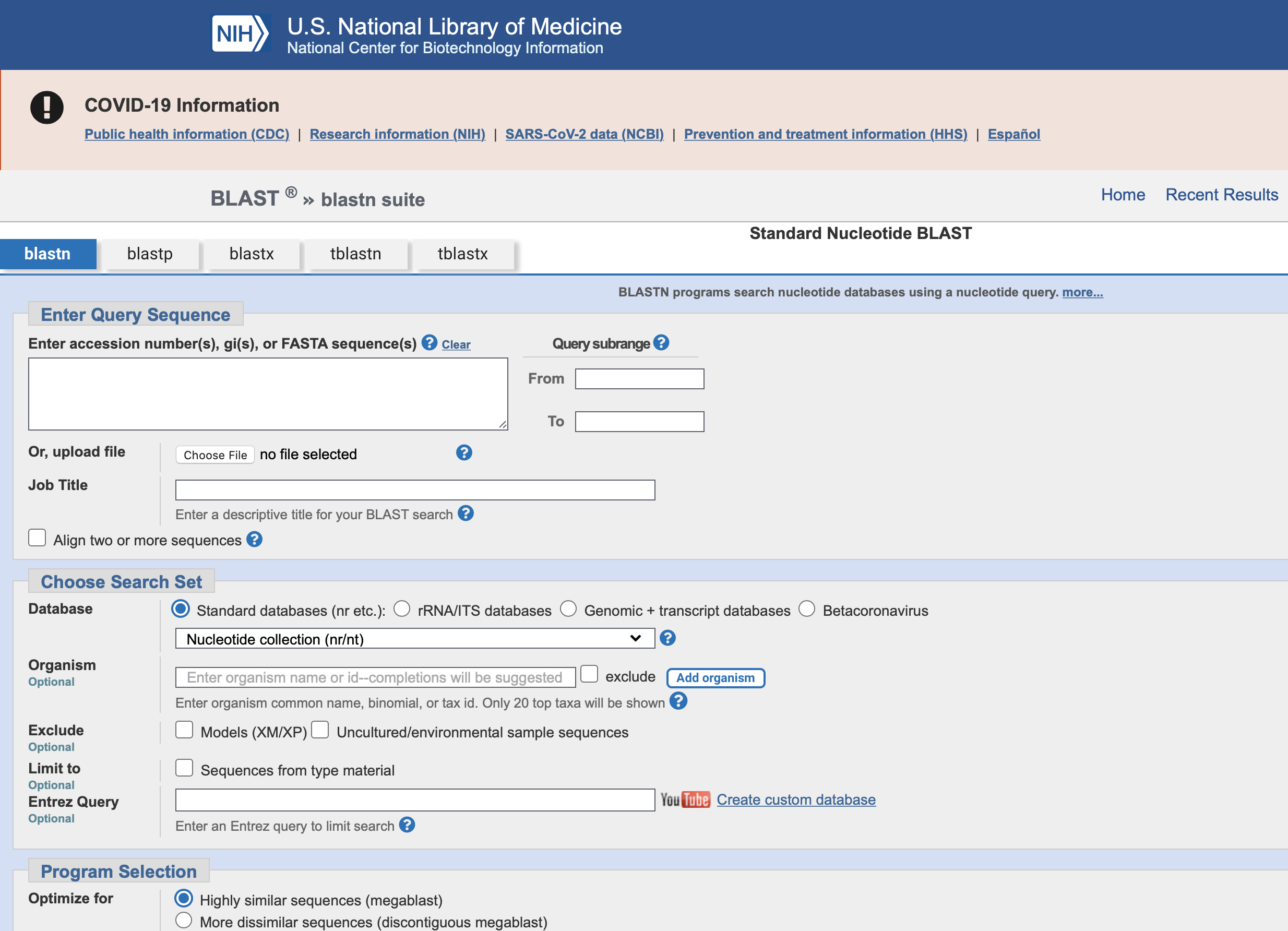 Go to NCBI BLAST https://blast.ncbi.nlm.nih.gov/Blast.cgi and click on Nucleotide BLAST.